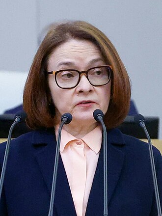 Elvira Sakhipzadovna Nabioullina (ou en anglais Nabiullina), née le 29 octobre 1963, est une économiste russe et gouverneure de la Banque centrale de Russie. Elle a également été ministre du Développement économique de 2007 à 2012, puis conseillère économique du président Vladimir Poutine. |