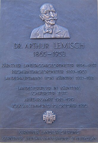 Biographie d'Arthur Lemisch (extrait)Arthur Lemisch, né le 4 février 1865 à Sankt Veit an der Glan et mort le 29 octobre 1953 dans la même ville, est un homme politique autrichien. Il dirige la Carinthie comme « Landesverweser » de 1918 à 1921, puis comme gouverneur du Land de 1927 à 1931.