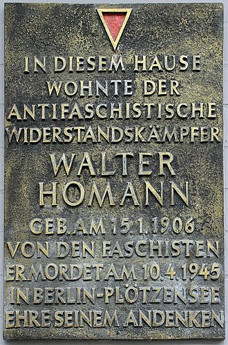 Walter Homann, né le 15 janvier 1906 à Berlin et mort le 10 avril 1945 à Berlin-Plötzensee, était un résistant allemand membre du réseau antifasciste connu sous le nom d’Orchestre rouge. Serrurier de profession, il travailla à l’usine de turbines AEG de Berlin-Moabit. |