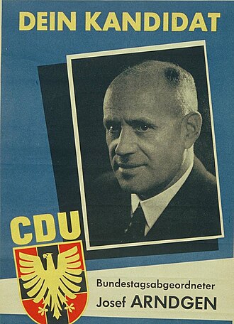 Josef Arndgen (24 February 1894 – 20 September 1966) est un homme politique allemand membre de l’Union chrétienne-démocrate (CDU).Il adhère au Zentrum en 1931, parti dissous en 1933, puis participe après la Seconde Guerre mondiale à la fondation de la CDU à Francfort-sur-le-Main. |